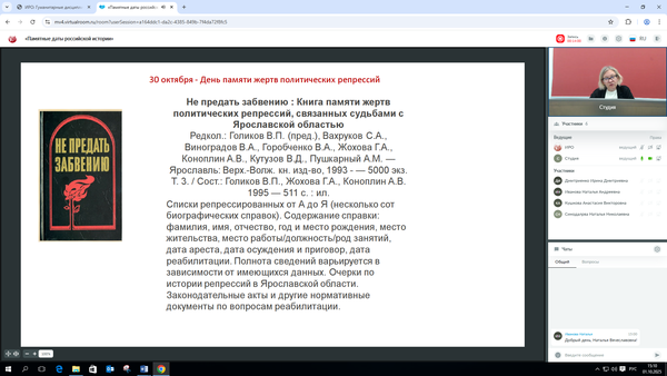 01 октября 2025 года состоялся вебинар «Памятные даты российской истории» в рамках которого шла речь о Дне памяти жертв политических репрессий (30 октября).